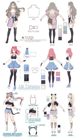 ( Fullbody Colored LineArt, Lineart clothes and details, text, palette, side and back view fullbody cell shading )